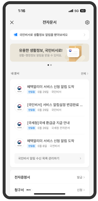 각 앱에서 ‘국민비서’, ‘공공알림’, ‘전자문서’ 등 메뉴 확인 후 신청 가능
