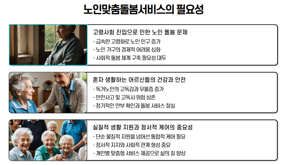 노후의 외로움과 불안은 우리 모두의 문제입니다. 노인맞춤돌봄서비스는 단순한 복지 제도를 넘어, 사람 중심의 따뜻한 복지를 실현하는 정책입니다.