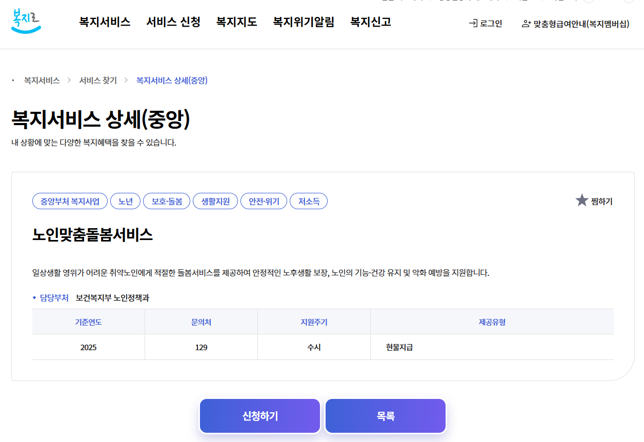 - 🌐 온라인 신청: 복지로 접속 → [복지서비스 신청] → [노년] → [노인맞춤돌봄서비스]
