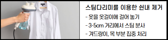 - 스팀다림질 후에는 바람 잘 통하는 곳에 10~20분 정도 걸어둬 자연 건조하면 쉰내가 훨씬 줄어듭니다.
