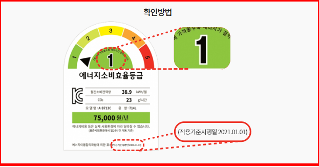 제품은 1등급 라벨이 부착되어 있고, 기준 시행일 이후 제품이어야 합니다.