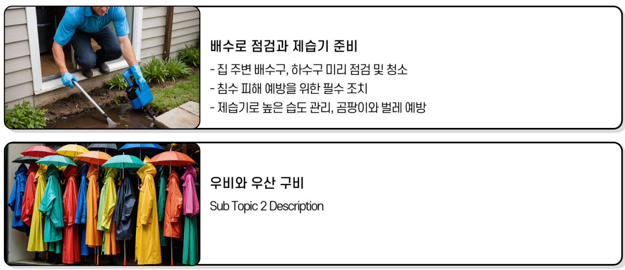 장마에 대비하는 것은 단순한 불편을 줄이는 것을 넘어서 ‘생존’과 ‘안전’의 문제입니다. 아래 체크리스트를 참고해보세요.